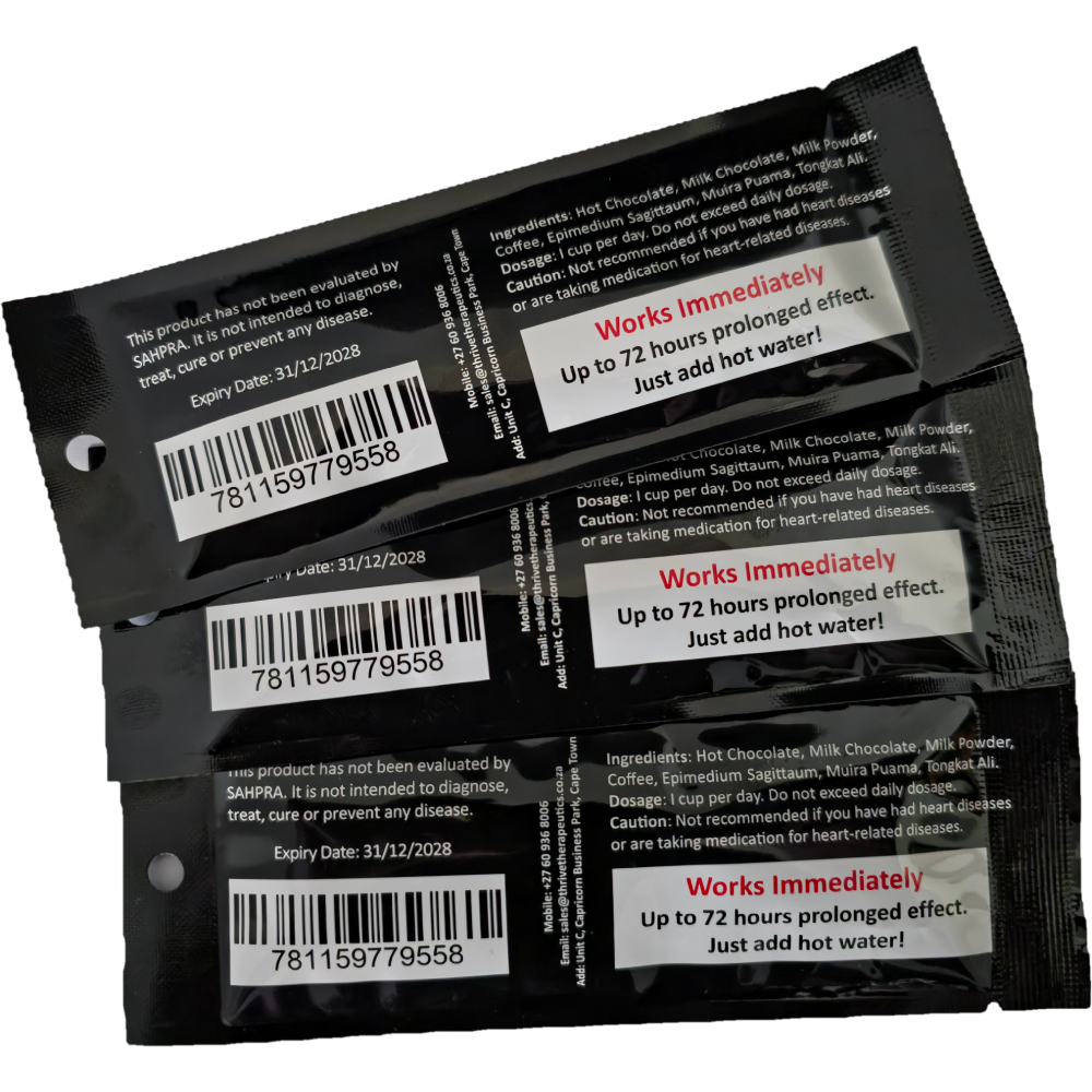 - Key Ingredients: Premium Coffee, Hot Chocolate, Milk Powder, Epimedium Sagittatum, Muira Puama, Tongkat Ali.